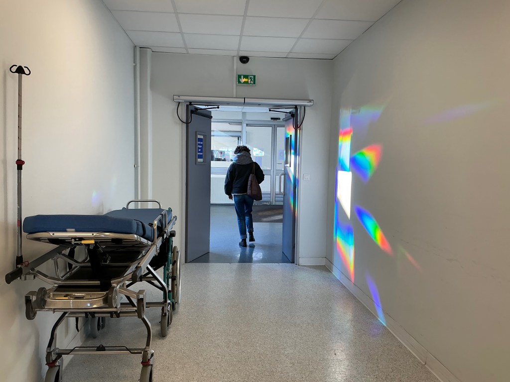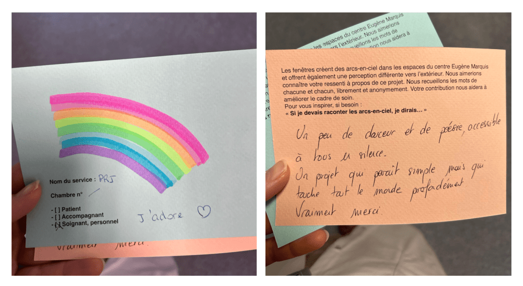 Au fil du temps, de l’heure et des saisons, des effets lumineux furtifs apparaissent dans les espaces du Centre Eugène Marquis. Presque magiques, ils se glissent aussi bien dans les espaces communs que dans l’intimité des chambres. Ces éclats de lumière colorée ouvrent des portes à l’imaginaire- ne serait-ce qu’un instant. Ces petites parenthèses enchantées ponctuent les parties Est, Sud et Ouest du bâtiment d’hospitalisation et ainsi contribuent au climat de soin en y insufflant une part d’émerveillement.