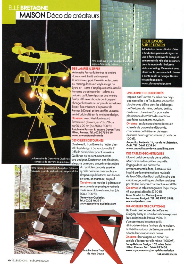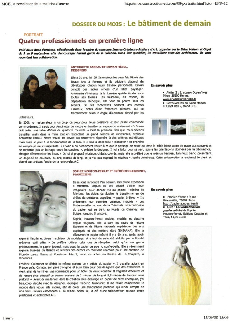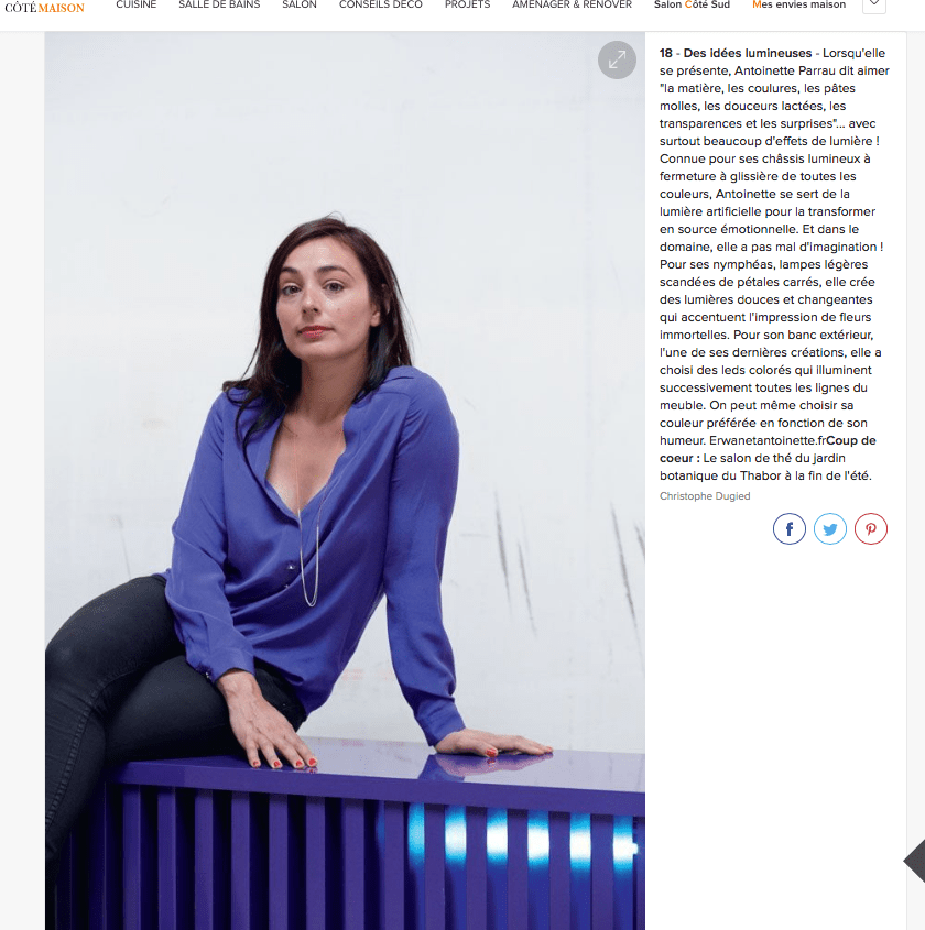 Sortie de l’Ecole régionale des Beaux Arts de Rennes (DNSEP, 2004 ), Antoinette Parrau a développé un travail d’autoédition présenté sur de nombreux salons du design. Biennale internationale de design de Saint Etienne en 2006, Maison & Objet sur les talents à la cartes en 2007, Scènes d’intérieurs 2008, ou le salon du meuble de Milan sur le Satellite en 2007. À la suite de ce travail d’édition, Antoinette Parrau développe des recherches autour de la manipulation de la lumière pour lesquels le Centre National des Art Plastiques lui attribue une allocation de séjour et de recherches (2009). Antoinette Parrau traite de la lumière colorée dans l’espace urbanisé avec les bancs lumineux proposés pour Nuit Blanche à Mayenne et exposés dans la cours 40mcube Rennes en 2011. Antoinette Parrau traite la lumière colorée comme des paysages lumineux dans l’espace domestique. Elle utilise la lumière pour prolonger l’ imaginaire et inspirer un bien-être comme être face à la mer. Elle exprime la lumière comme une source de confort émotionnel.